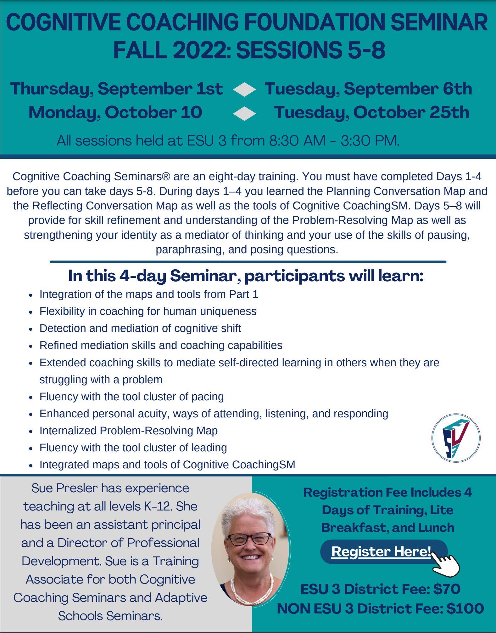 Cognitive Coaching Seminars® are an eight-day training. You must have completed Days 1-4 before you can take days 5-8. During days 1–4 you learned the Planning Conversation Map and the Reflecting Conversation Map as well as the tools of Cognitive CoachingSM. Days 5–8 will provide for skill refinement and understanding of the Problem-Resolving Map as well as strengthening your identity as a mediator of thinking and your use of the skills of pausing, paraphrasing, and posing questions.
