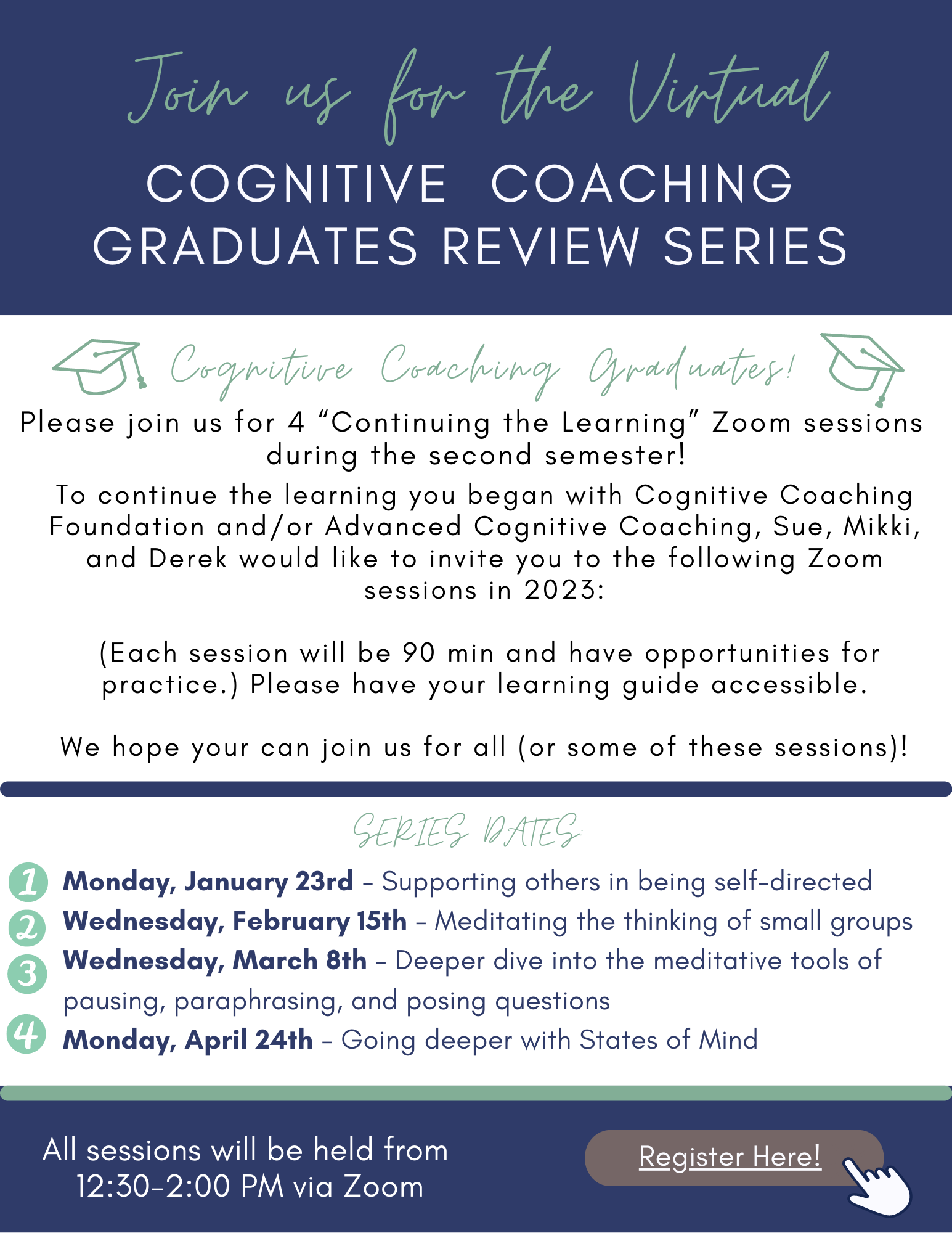 | Description | | Please join us for 4 "Continuing the Learning" Zoom sessions during the second semester! To continue the learning you began with Cognitive Coaching Foundation and/or Advanced Cognitive Coaching, Sue, Mikki, and Derek would like to invite you to the following Zoom sessions in 2023: