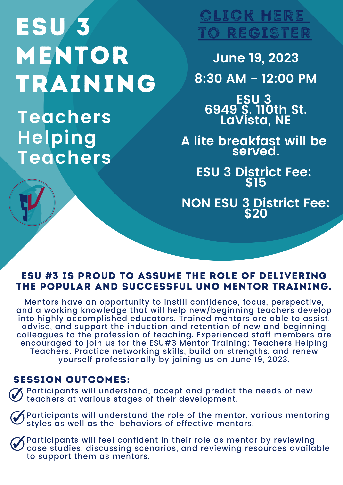 Mentors have an opportunity to instill confidence, focus, perspective, and a working knowledge that will help new/beginning teachers develop into highly accomplished educators. Trained mentors are able to assist, advise, and support the induction and retention of new and beginning colleagues to the profession of teaching. Experienced staff members are encouraged to join us for the ESU#3 Mentor Training: Teachers Helping Teachers. Practice networking skills, build on strengths, and renew yourself professionally by joining us on June 19th.