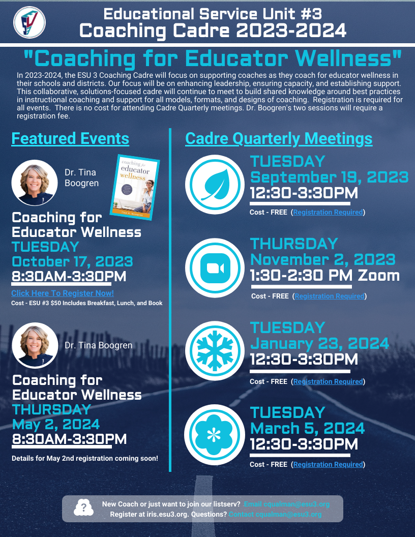 In 2023-2024, the ESU 3 Coaching Cadre will focus on supporting coaches as they coach for educator wellness in their schools and districts. Our focus will be on enhancing leadership, ensuring capacity, and establishing support.