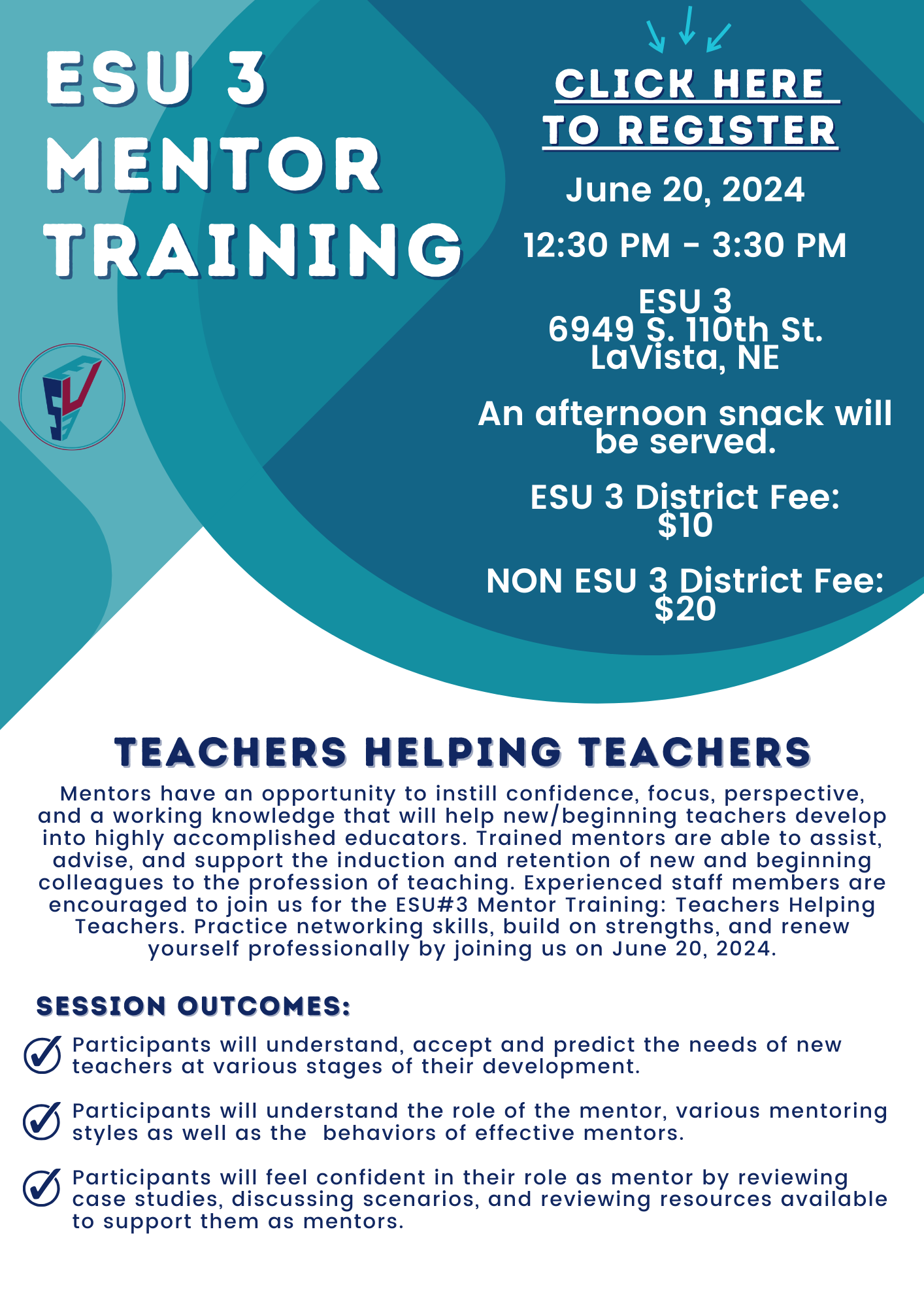 Mentors have an opportunity to instill confidence, focus, perspective, and a working knowledge that will help new/beginning teachers develop into highly accomplished educators. Trained mentors are able to assist, advise, and support the induction and retention of new and beginning colleagues to the profession of teaching. Experienced staff members are encouraged to join us for the ESU#3 Mentor Training: Teachers Helping Teachers. Practice networking skills, build on strengths, and renew yourself professionally by joining us on June 20th.