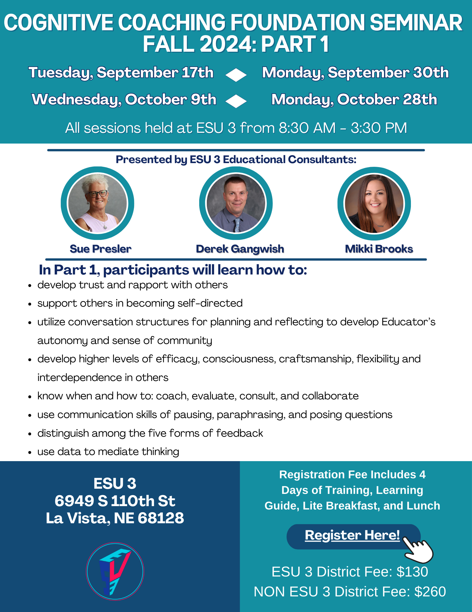 Disclaimer: By participating in this event organized by ESU #3, you hereby grant permission to ESU #3 to use your image and likeness captured during the event for promotional and media purposes. This includes, but is not limited to, photographs, videos, and audio recordings. If you wish to withdraw your consent regarding the use of your media, please reach out to the primary contact of this event.