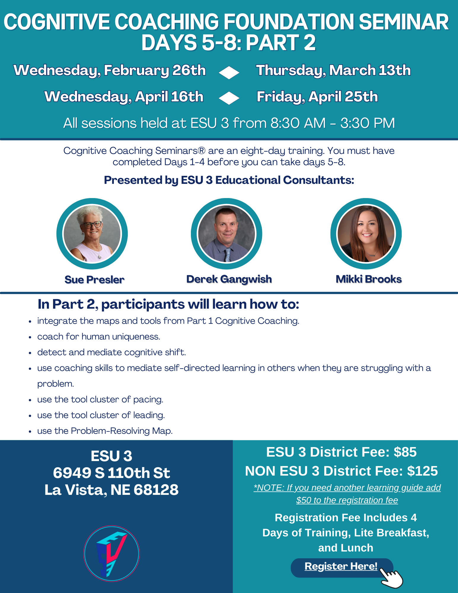 Disclaimer: By participating in this event organized by ESU #3, you hereby grant permission to ESU #3 to use your image and likeness captured during the event for promotional and media purposes. This includes, but is not limited to, photographs, videos, and audio recordings. If you wish to withdraw your consent regarding the use of your media, please reach out to the primary contact of this event. |