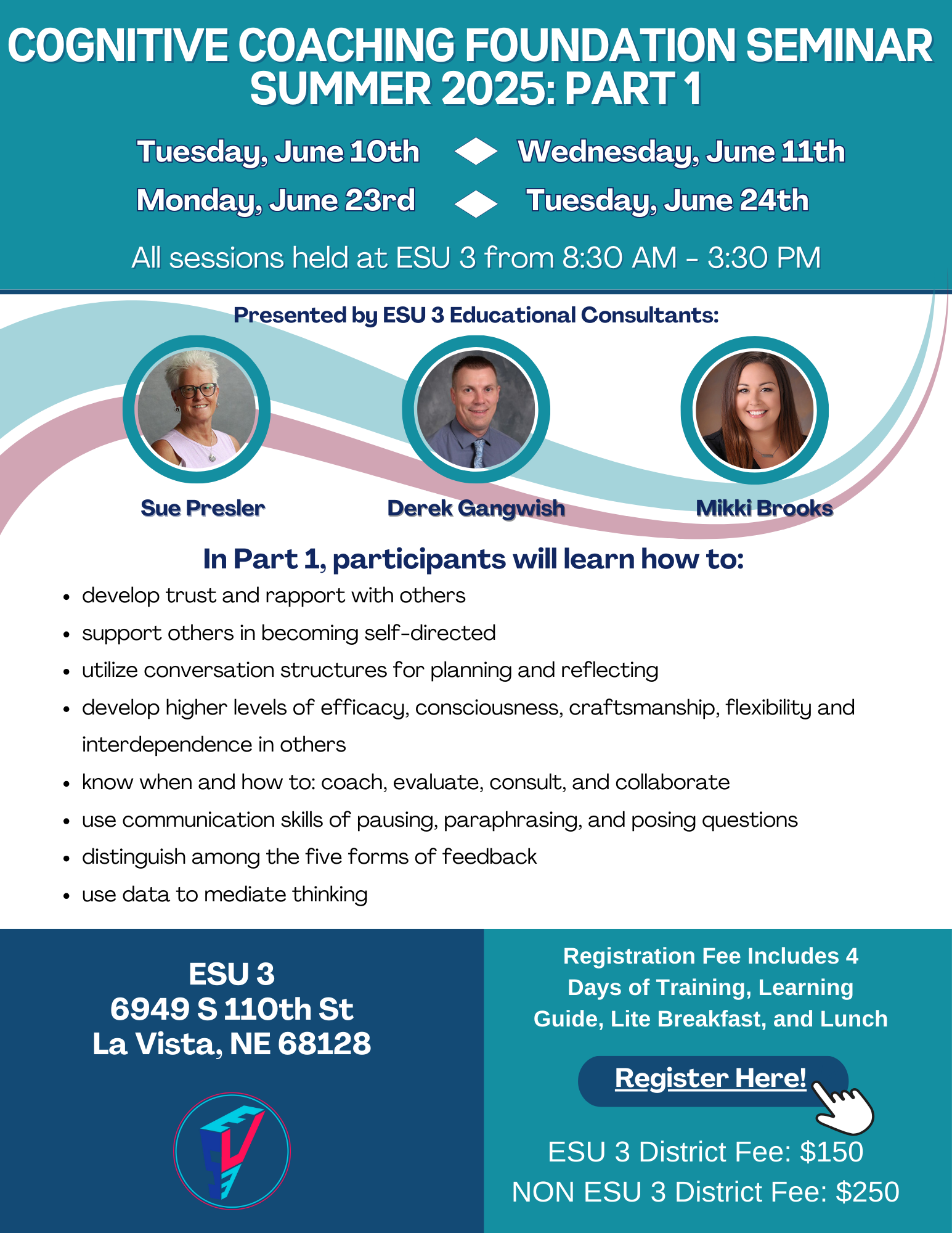 Disclaimer: By participating in this event organized by ESU #3, you hereby grant permission to ESU #3 to use your image and likeness captured during the event for promotional and media purposes. This includes, but is not limited to, photographs, videos, and audio recordings. If you wish to withdraw your consent regarding the use of your media, please reach out to the primary contact of this event. |