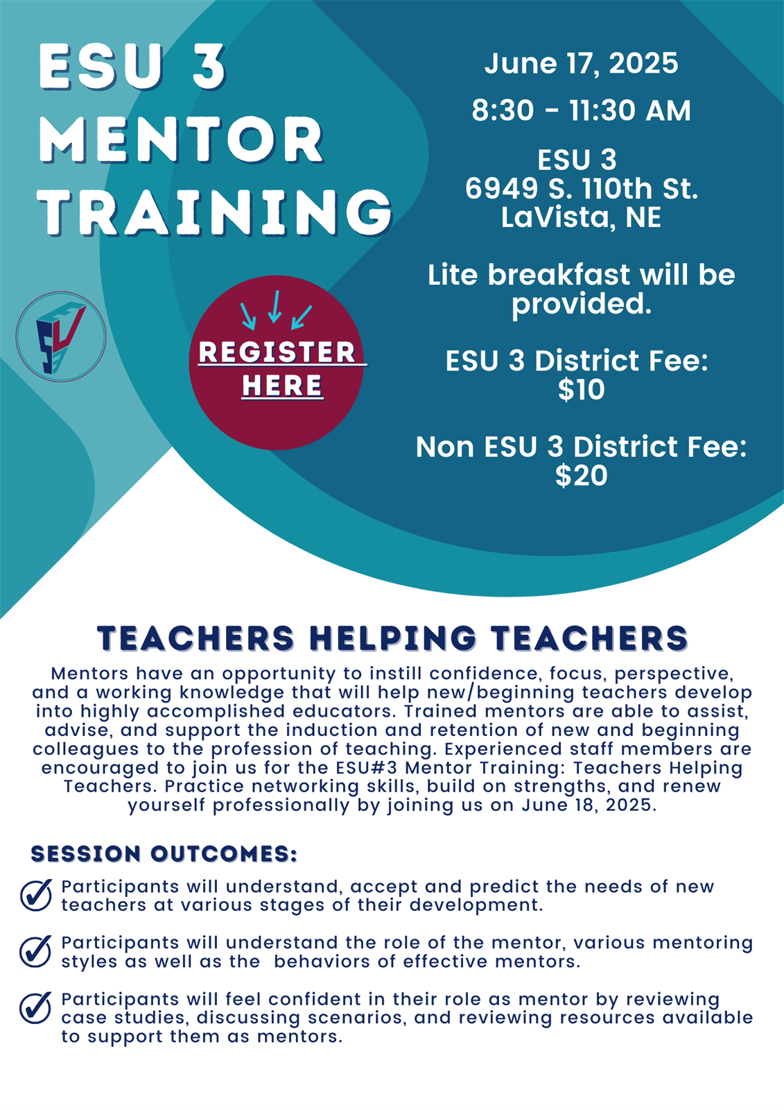 | Description | | Mentors have an opportunity to instill confidence, focus, perspective, and a working knowledge that will help new/beginning teachers develop into highly accomplished educators. Trained mentors are able to assist, advise, and support the induction and retention of new and beginning colleagues to the profession of teaching. Experienced staff members are encouraged to join us for the ESU#3 Mentor Training: Teachers Helping Teachers. Practice networking skills, build on strengths, and renew yourself professionally by joining us on June 18, 2025.