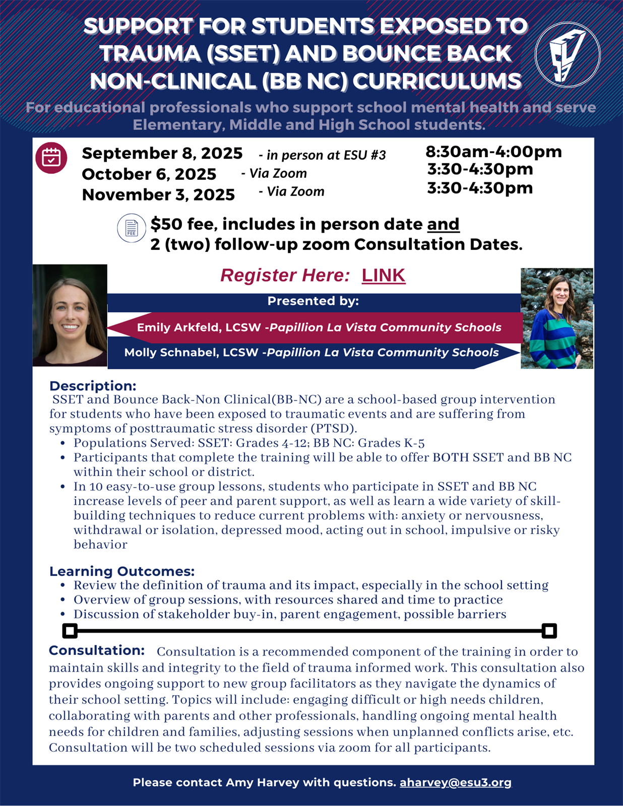 Please contact Amy Harvey with questions. aharvey@esu3.org |
