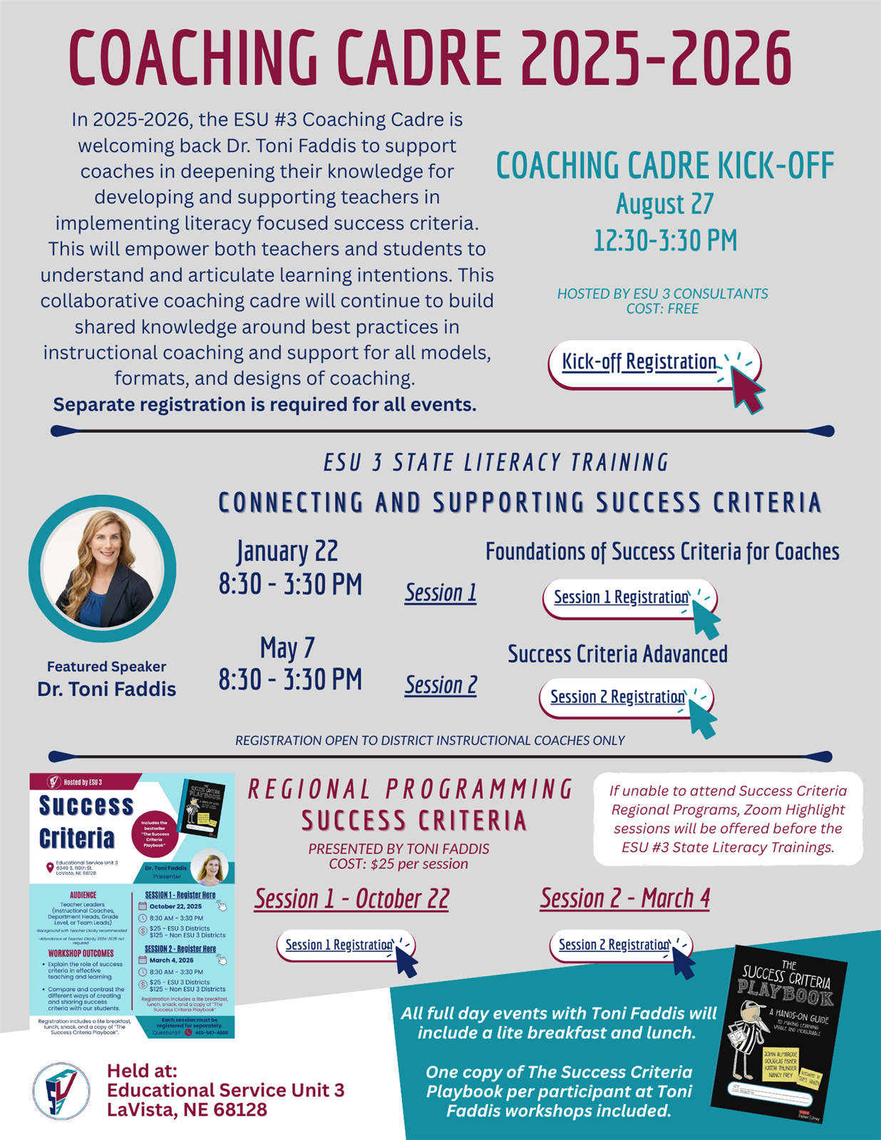 | Description | | In 2025-2026, the ESU #3 Coaching Cadre is welcoming back Dr. Toni Faddis to support coaches in deepening their knowledge for developing and supporting teachers in implementing literacy focused success criteria. This will empower both teachers and students to understand and articulate learning intentions. This collaborative coaching cadre will continue to build shared knowledge around best practices in instructional coaching and support for all models, formats, and designs of coaching.