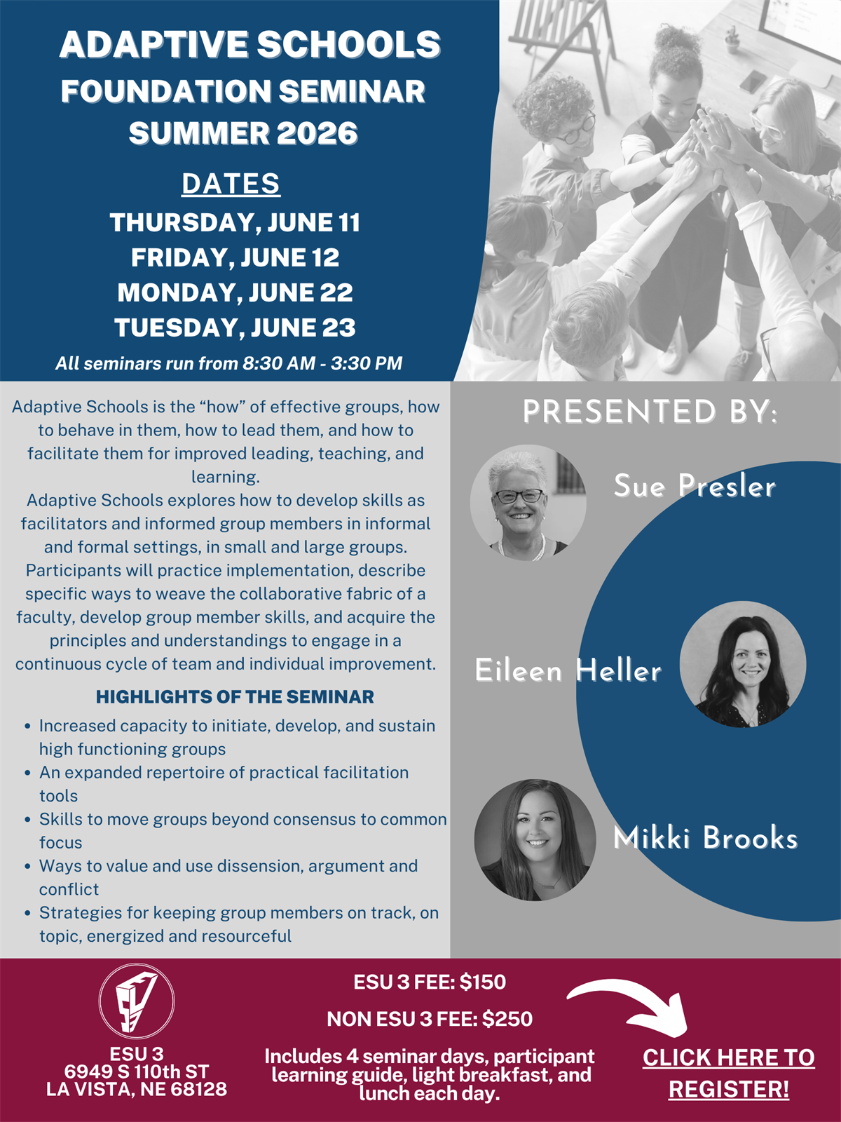 Disclaimer: By participating in this event organized by ESU #3, you hereby grant permission to ESU #3 to use your image and likeness captured during the event for promotional and media purposes. This includes, but is not limited to, photographs, videos, and audio recordings. If you wish to withdraw your consent regarding the use of your media, please reach out to the primary contact of this event.