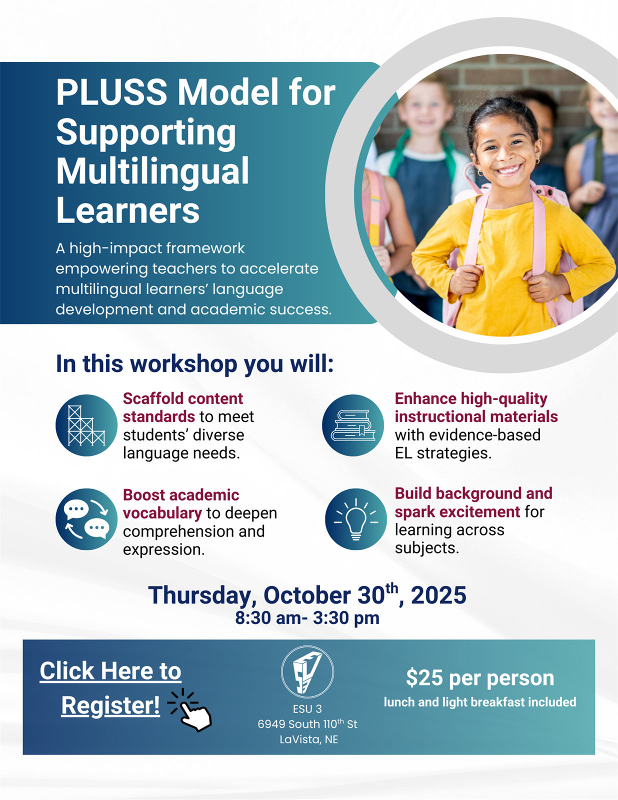 Disclaimer: By participating in this event organized by ESU #3, you hereby grant permission to ESU #3 to use your image and likeness captured during the event for promotional and media purposes. This includes, but is not limited to, photographs, videos, and audio recordings. If you wish to withdraw your consent regarding the use of your media, please reach out to the primary contact of this event. |
