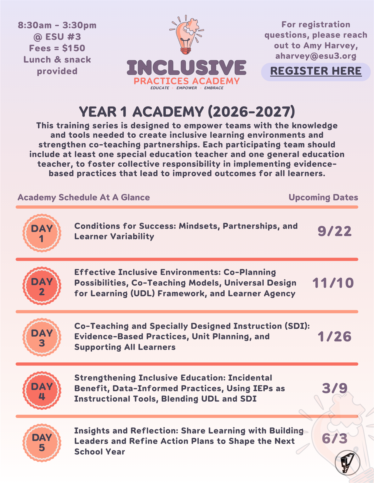 This training series is designed to empower teams with the knowledge and tools needed to create inclusive learning environments and strengthen co-teaching partnerships. Each participating team should include at least one special education teacher and one general education teacher, to foster collective responsibility in implementing evidence-based practices that lead to improved outcomes for all learners.