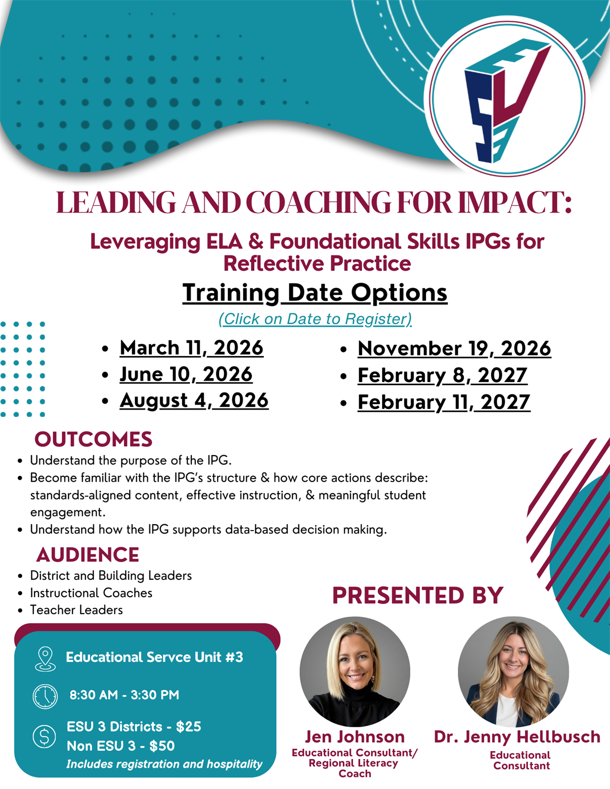 Disclaimer: By participating in this event organized by ESU #3, you hereby grant permission to ESU #3 to use your image and likeness captured during the event for promotional and media purposes. This includes, but is not limited to, photographs, videos, and audio recordings. If you wish to withdraw your consent regarding the use of your media, please reach out to the primary contact of this event. |