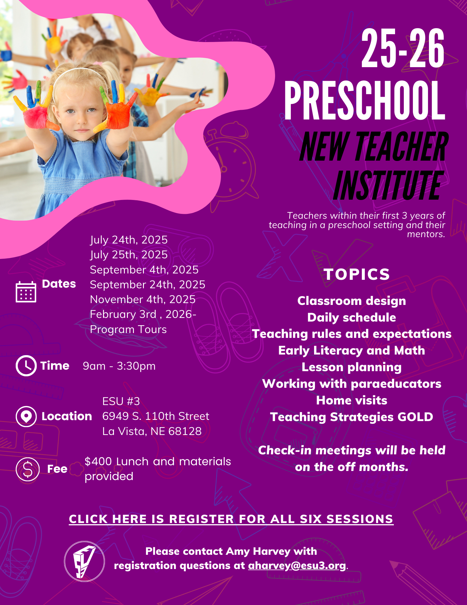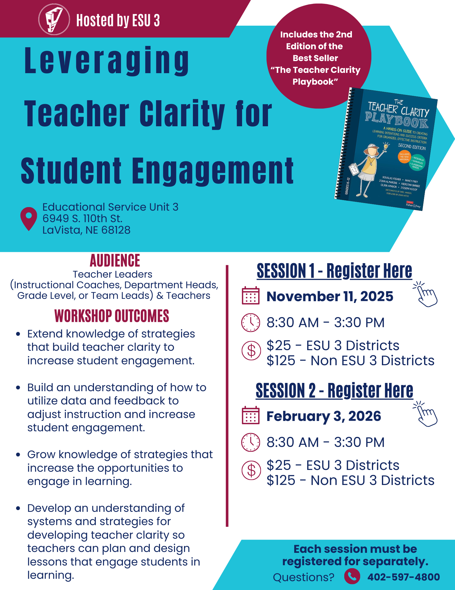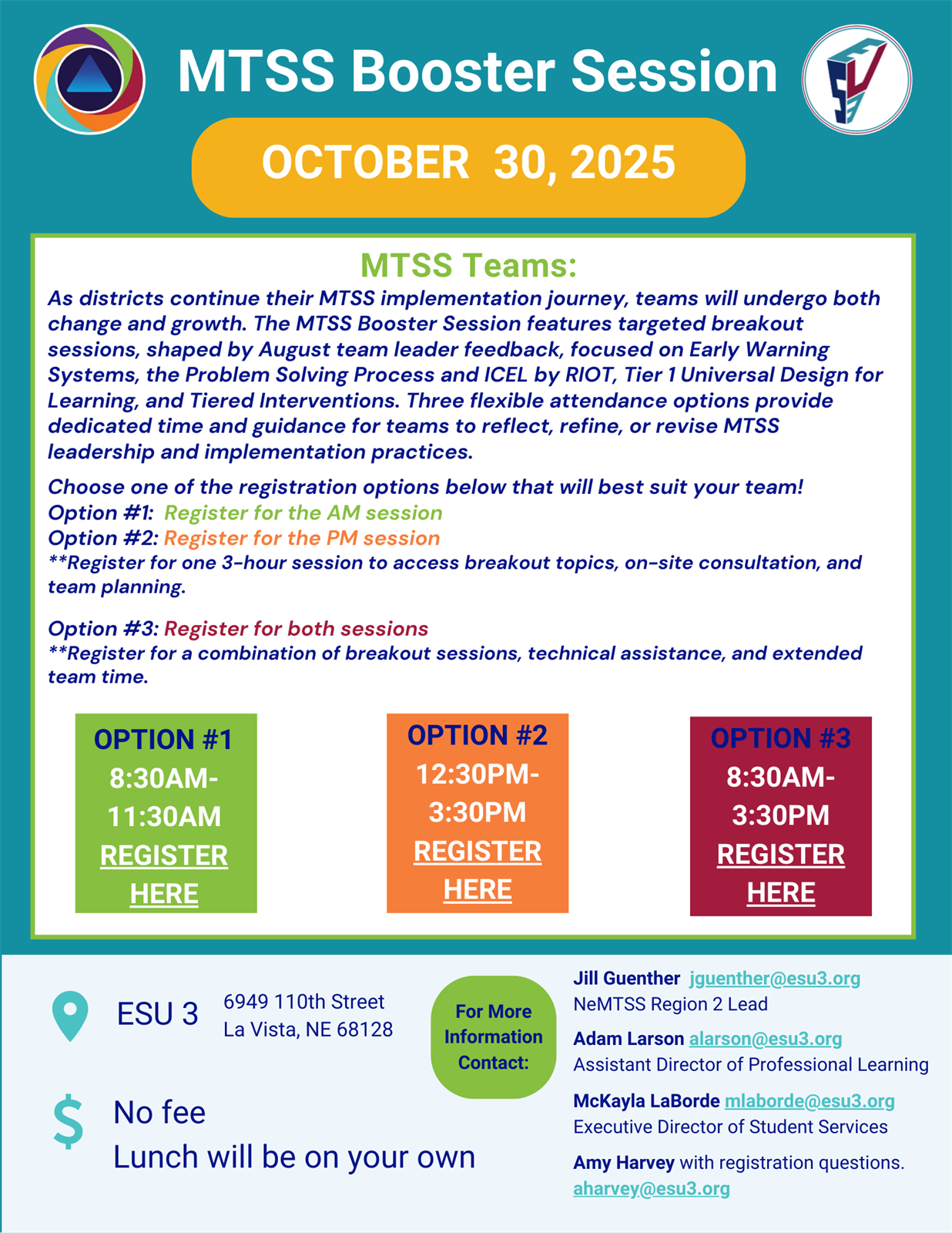 Disclaimer: By participating in this event organized by ESU #3, you hereby grant permission to ESU #3 to use your image and likeness captured during the event for promotional and media purposes. This includes, but is not limited to, photographs, videos, and audio recordings. If you wish to withdraw your consent regarding the use of your media, please reach out to the primary contact of this event.