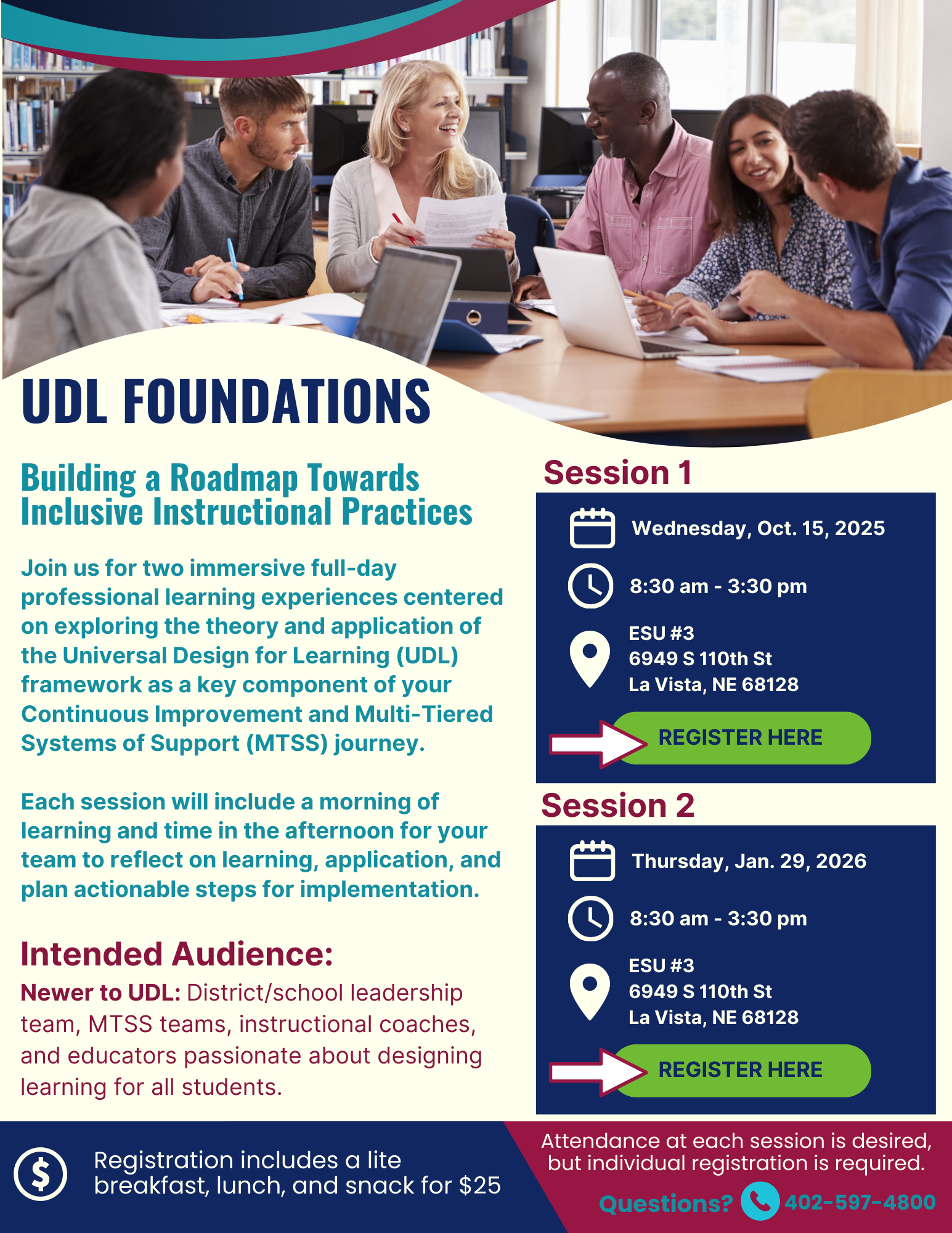 | 24036 | UDL Foundations: Building a Roadmap To Learning for All Session 1 | 10/15/2025 8:30:00 AM | | ESU#3 Professional Learning | | System.Collections.Generic.List`1[odie.workshops.Facilitator] | | 0.00 |  | odie.workshops.Section |