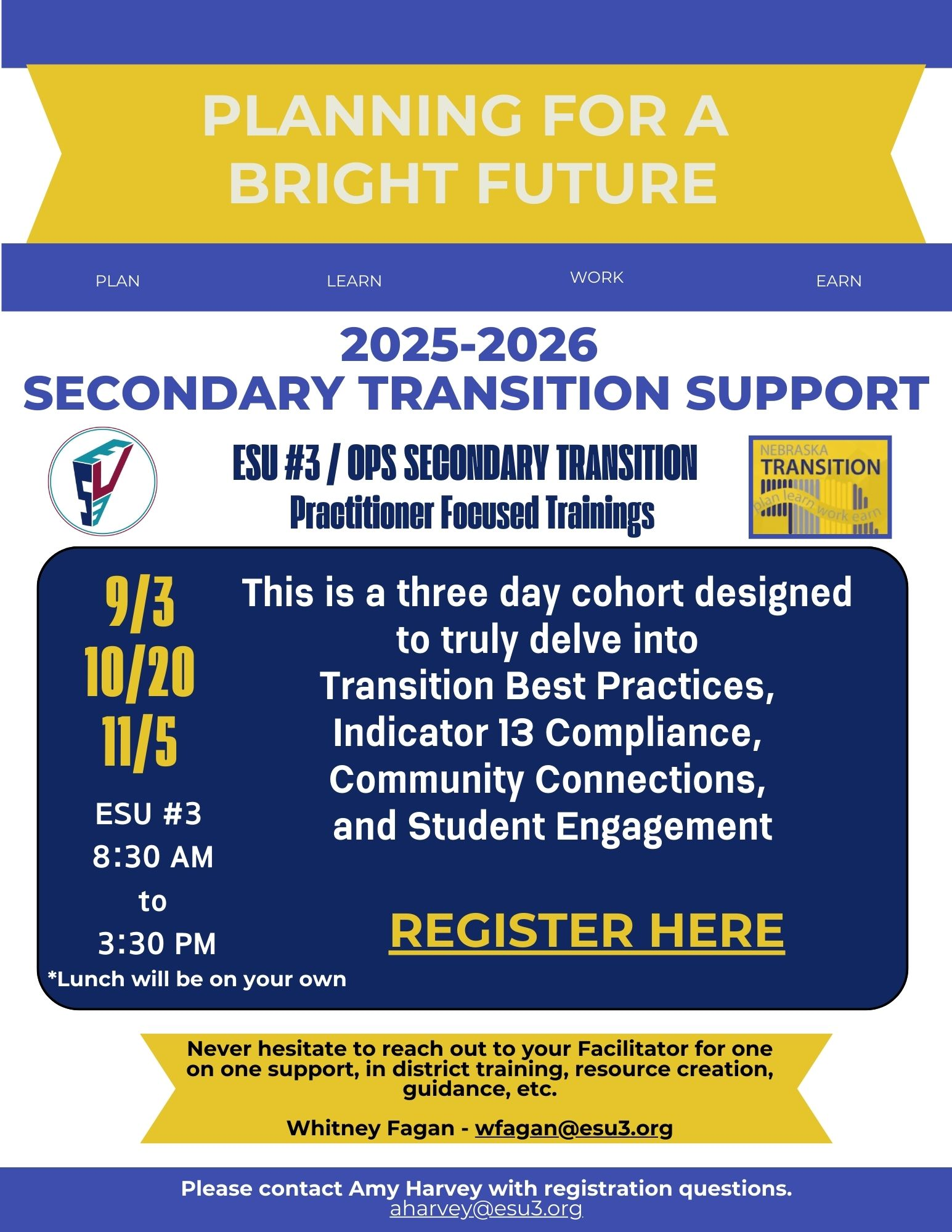 | 23935 | Planning a Bright Future: Secondary Transition | 10/20/2025 8:30:00 AM | | ESU#3 Student Services | | System.Collections.Generic.List`1[odie.workshops.Facilitator] | | 0.00 |  | odie.workshops.Section |