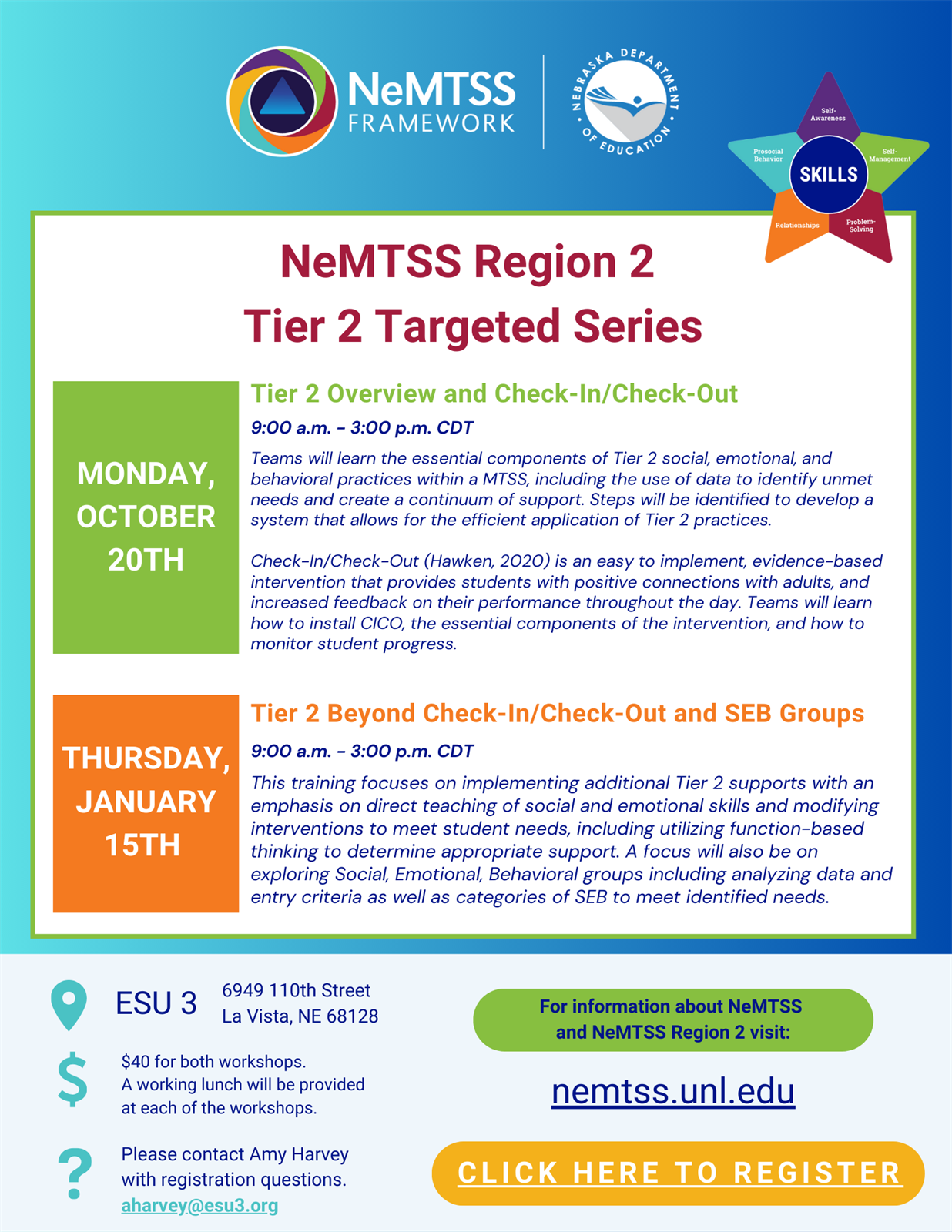 | | 24025 | NeMTSS Tier 2 Targeted Series | 1/15/2026 9:00:00 AM | | ESU#3 Student Services | Harvey | System.Collections.Generic.List`1[odie.workshops.Facilitator] | | 0.00 |  | odie.workshops.Section |