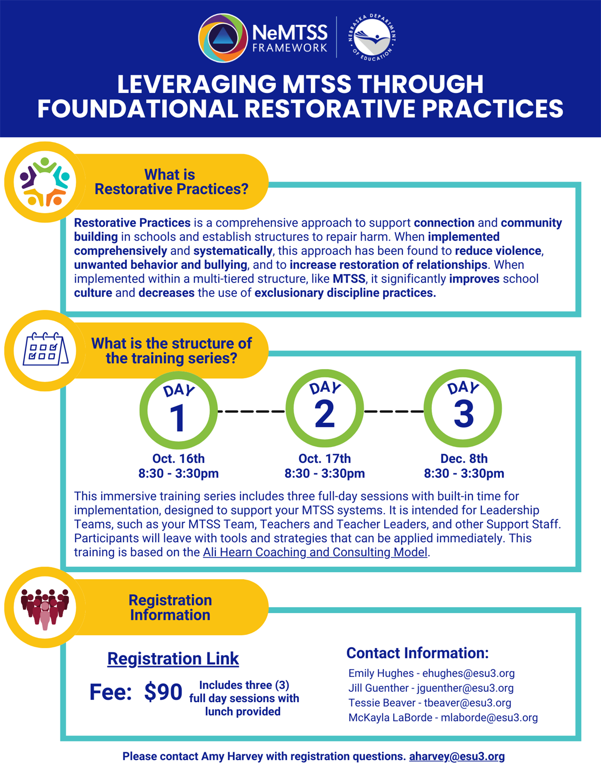 | 24050 | Leveraging MTSS through Foundational Restorative Practices | 10/16/2025 8:30:00 AM | | ESU#3 Student Services | | System.Collections.Generic.List`1[odie.workshops.Facilitator] | | 0.00 |  | odie.workshops.Section |