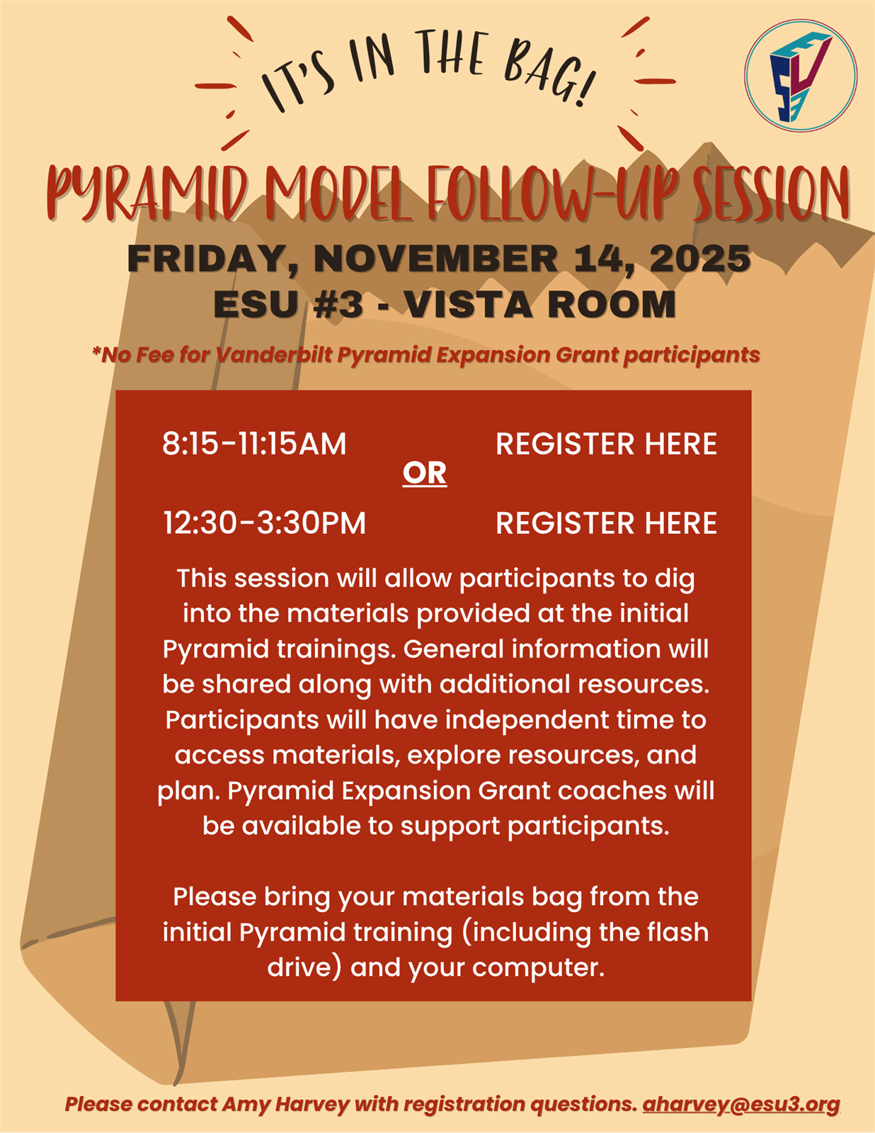 This session will allow participants to dig into the materials provided at the initial Pyramid trainings. General information will be shared along with additional resources. Participants will have independent time to access materials, explore resources, and plan. Pyramid Expansion Grant coaches will be available to support participants.