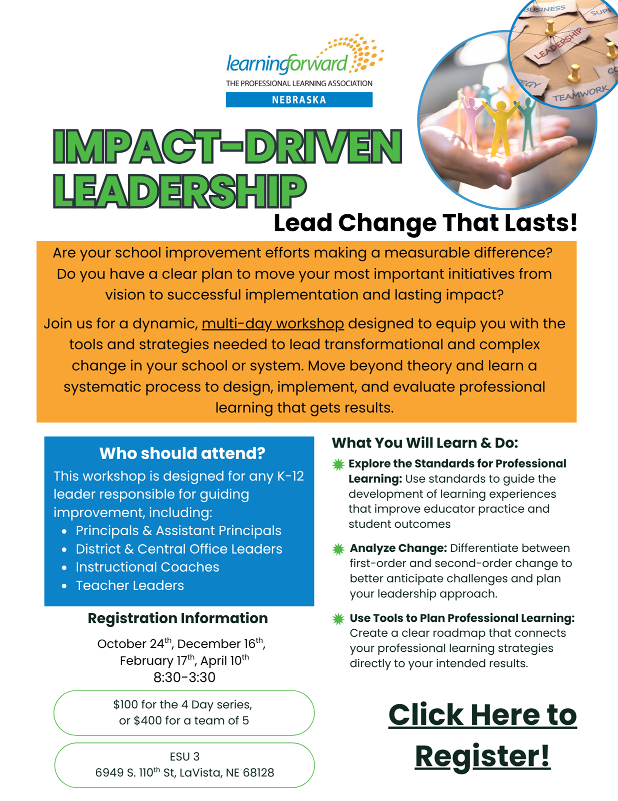 Currenlty, this workshop series is only open to the 18 schools districts that are serviced by ESU 3. If you have questions about attending, please contact Jennifer Kennedy at jkennedy@esu3.org.