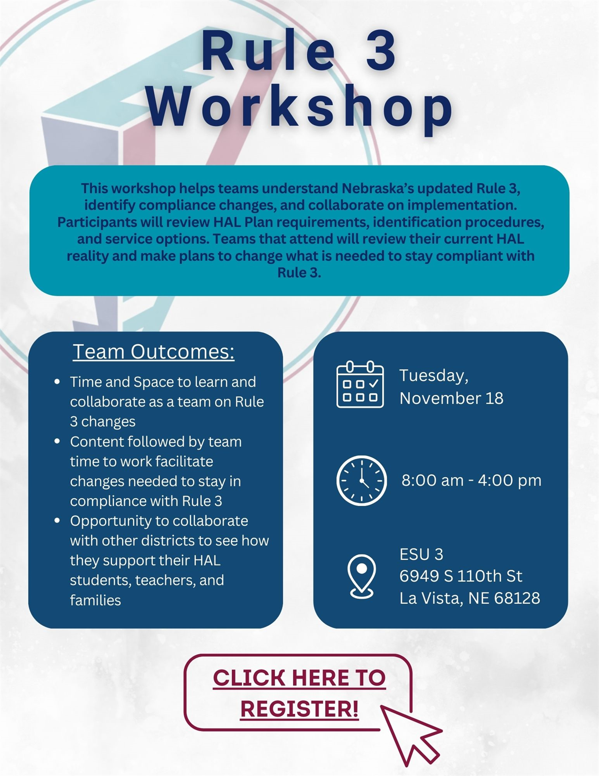 This workshop helps teams understand Nebraska’s updated Rule 3, identify compliance changes, and collaborate on implementation. Participants will review HAL Plan requirements, identification procedures, and service options. Teams that attend will review their current HAL reality and make plans to change what is needed to stay compliant with Rule 3.